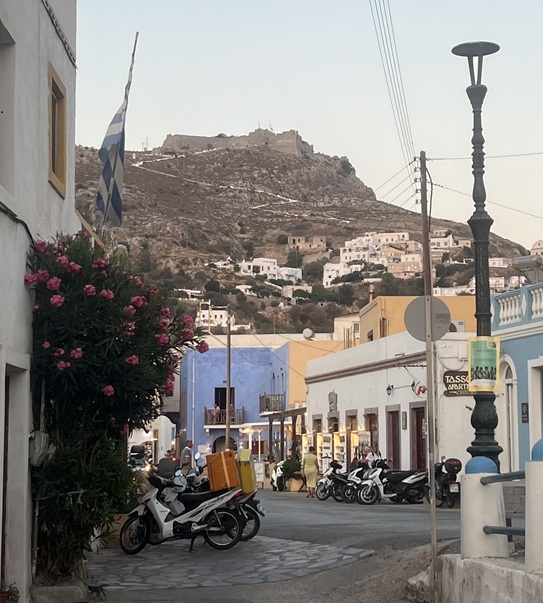 Anchored at the port of Leros Agia. At the top of the hill, you can see the castle.